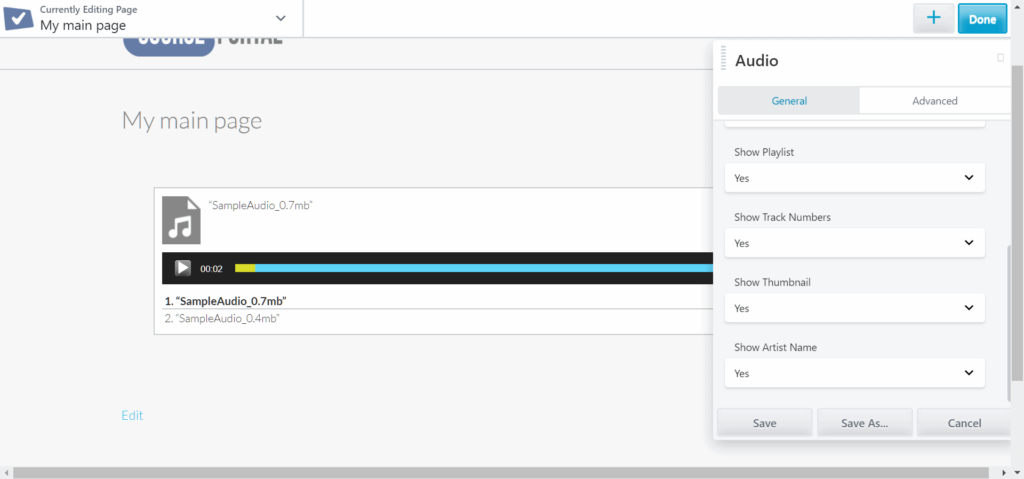 When you choose the Media Library option in the Audio module, click the link to choose one or more audio files to play. You can upload new files at that time also. After you add the audio files, some playback options appear.