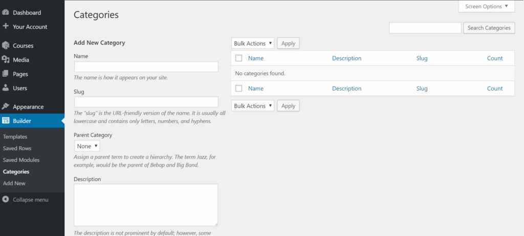 - In the WordPress admin panel, click Builder > Categories or Templates > Categories