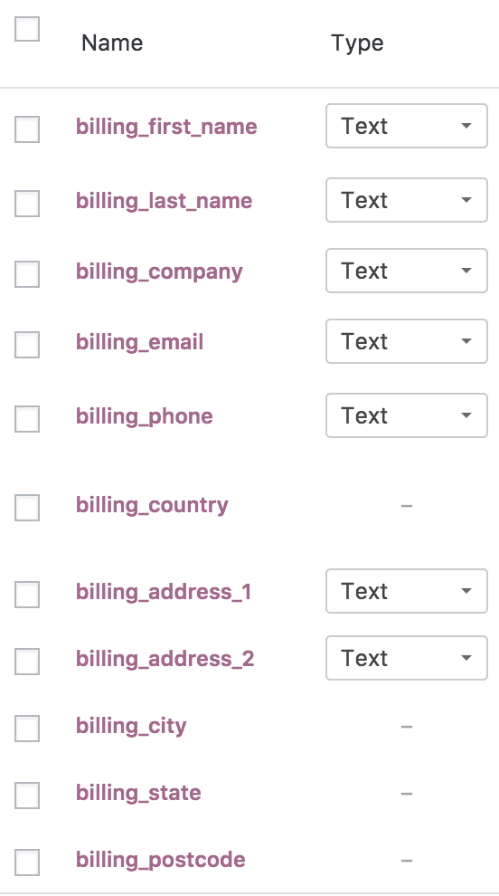 In the Billing and Shipping sections, there are core fields highlighted in purple.Note: Disabling or modifying core fields can cause unexpected results with some plugins; we recommend against whenever possible.