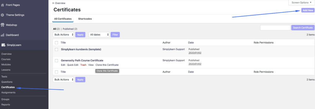 All certificate shortcodes are also listed in the WordPress admin area under Simplylearn > CERTIFICATES. Click on the Shortcodes tab at the top.