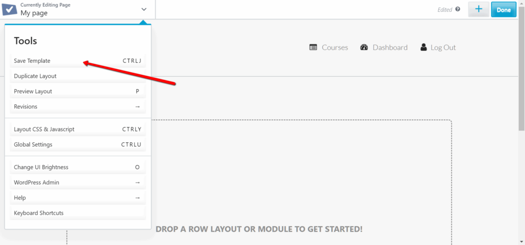 1. Click the Currently Editing Page button in the upper left corner, then choose Save Template.