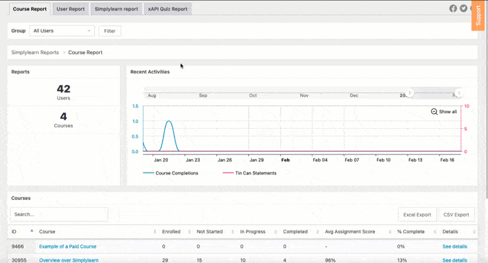 With our reporting tool, it is very easy to filter our reporting data by a specific group. You then have the ability to look at data across all courses that the group has access to. User reports for specific users in your group are also available.