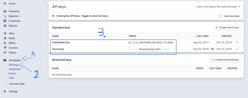 2. Locate the “Developers” menu, and then press “API Keys”. In the section for “Standard Keys” you will then find a “Publishable Key” and a “Secret Key”. You need both of these keys to set up your integration.