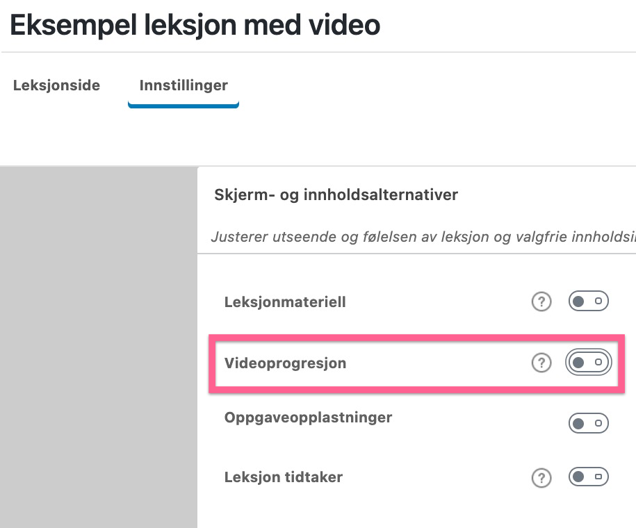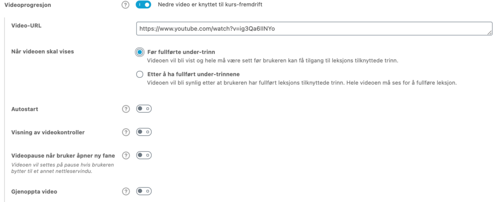 Denne innstillingen avgjør når videoen din skal vises til brukeren, og hvordan man skal håndtere deltrinn knyttet til modulen/leksjonen.