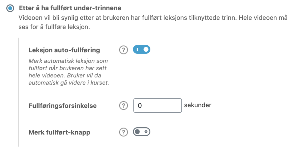 - Fullføringsforsinkelse. Dette refererer til forsinkelsen (i sekunder) mellom når videoen er ferdig og når modulen/leksjonen er merket fullført. Standard er ingen forsinkelse (0 sekunder)