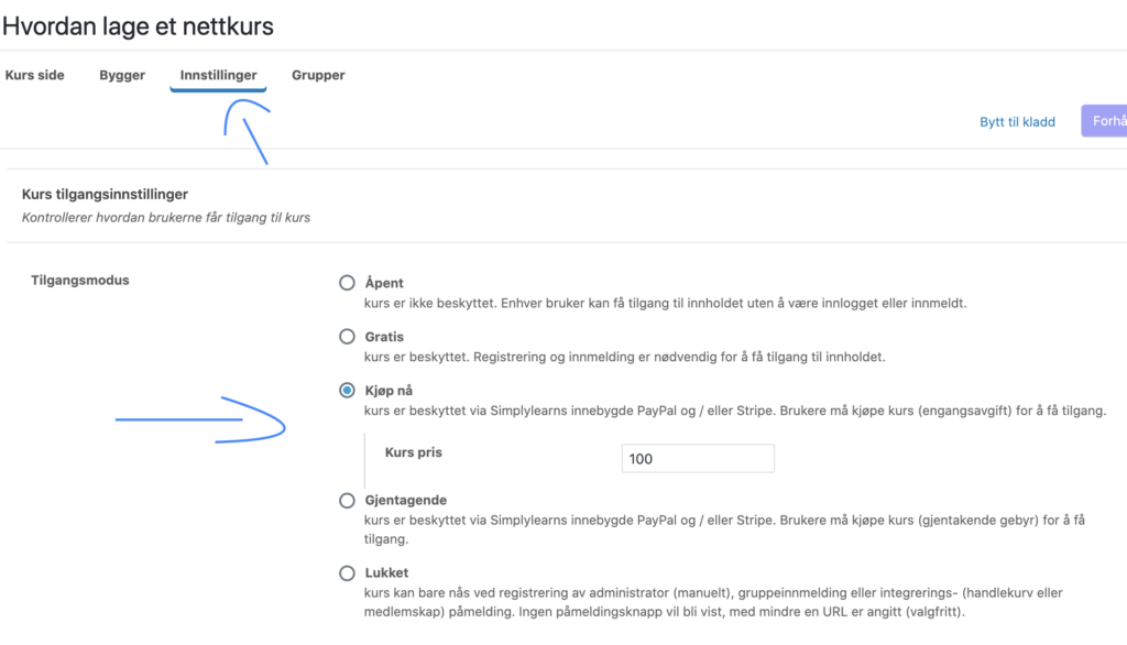 Når dette er satt opp så må du justere innstillingene for det spesifikke kurset som du ønsker å selge.