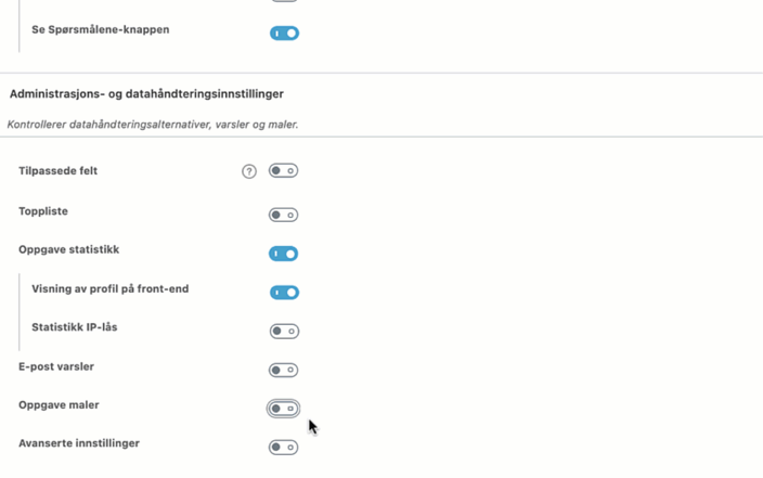 Sletting og oppdattering av navn på maler gjøres på oppgavenes globale innstillinger.