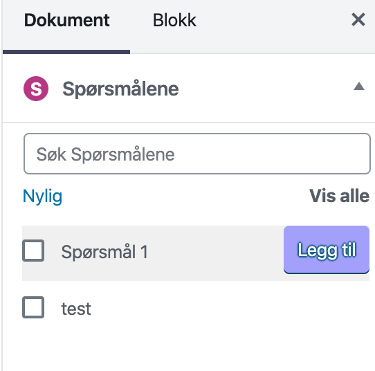 Alle de eksisterende spørsmålene dine finner du i «Spørsmål» -boksen i sidefeltet. Som standard vises de siste spørsmålene dine, men du kan klikke på «Vis alle» for å se alle spørsmål eller bruke søkefeltet til å finne et spesifikt spørsmål etter tittelen. Du kan enkelt legge til disse eksisterende spørsmålene i oppgaven din.