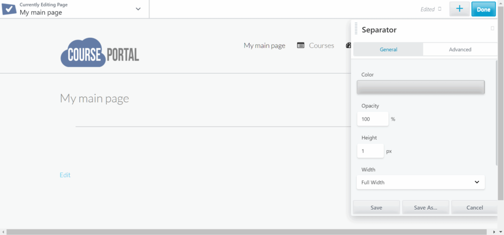The Separator module inserts a horizontal line to separate content. It can be styled for color, size, and spacing.