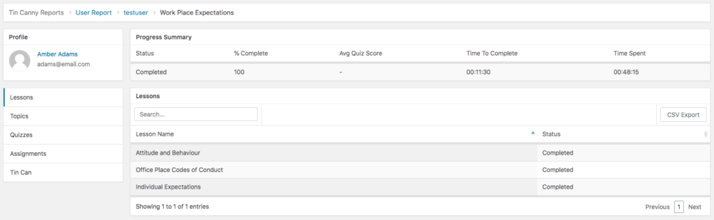 You can click anywhere in a row in the course list table to see the user’s progress in that particular course, including their overall performance and detailed activities of modules, lesson and tasks.